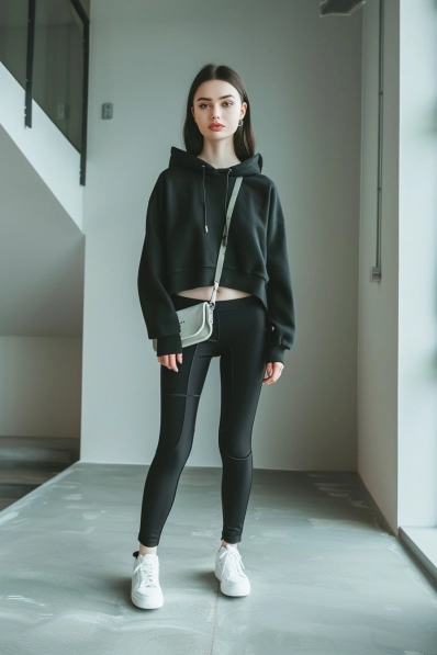 This look is the definition of comfy chic! With an oversized black hoodie paired with sleek black leggings, this outfit is perfect for a movie date where comfort is key. The cropped hoodie adds a bit of playfulness to the all-black ensemble, and the white sneakers break up the dark tones, keeping it fresh and modern. The crossbody bag is a great touch—hands-free and practical for keeping essentials close without any fuss.