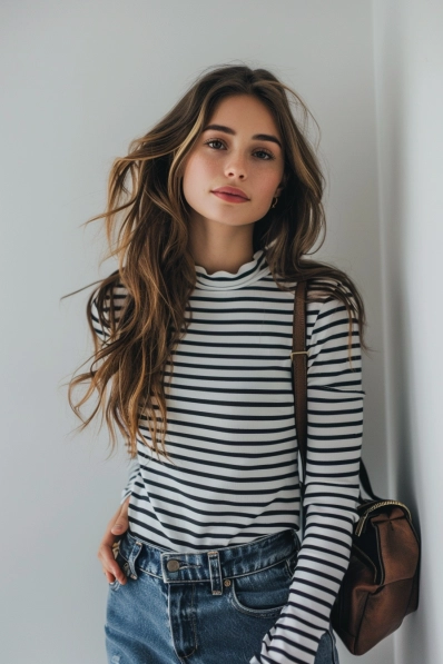 This outfit is such a timeless classic! The fitted striped top with delicate detailing at the neckline is perfectly tucked into high-waisted denim, creating a simple yet stylish look. The ruffled collar adds a little feminine charm, while the straight-leg jeans keep things casual and effortlessly cool. Add a leather crossbody bag, and you’ve got yourself a look that’s practical yet chic for any movie date.