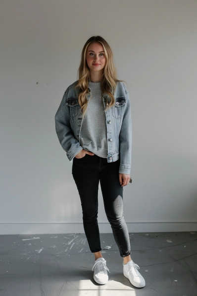 This look combines a light-wash denim jacket with a simple grey sweater, giving off a relaxed, effortlessly stylish vibe. Paired with black skinny jeans and crisp white sneakers, the outfit strikes that perfect balance between casual and cool. The slightly oversized fit of the jacket makes it perfect for layering, while the sneakers keep it practical and comfy for a night out at the movies.