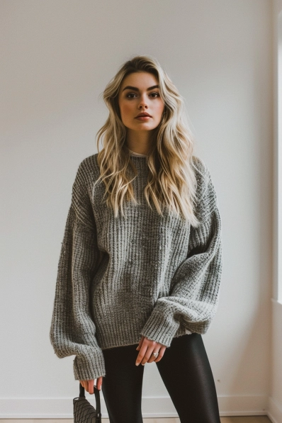 This outfit is the ultimate comfy-yet-stylish movie date look. The oversized grey knit sweater is perfect for snuggling into, with its relaxed fit and slightly slouchy sleeves. Pairing it with sleek black leggings keeps the look balanced and chic, adding a touch of form-fitting style without sacrificing comfort. A small crossbody bag adds just enough detail to elevate the look without taking away from its casual vibe.