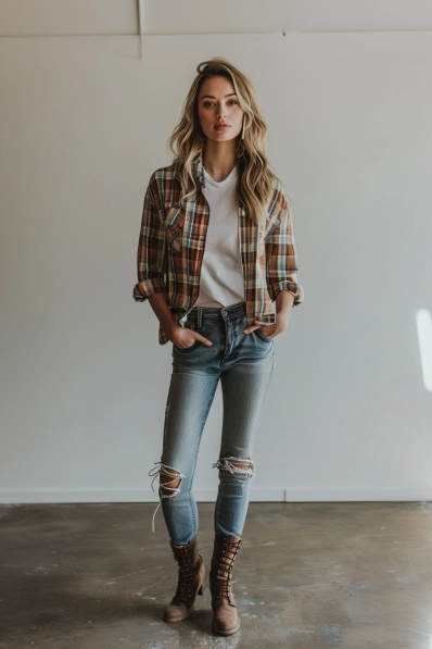 Rustic Vibes with a Plaid Shirt and Ripped Jeans