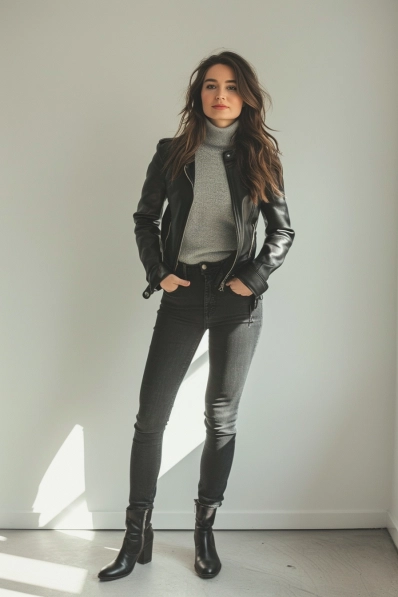 This outfit is all about understated style with a bold edge. A sleek black leather jacket paired with a soft grey turtleneck creates the perfect balance between edgy and cozy. The high-waisted black jeans complete the monochrome vibe, while the form-fitting cuts keep it sophisticated and put-together. This is the kind of look that says, “I’m here to be chic, but I’m not overdoing it.”