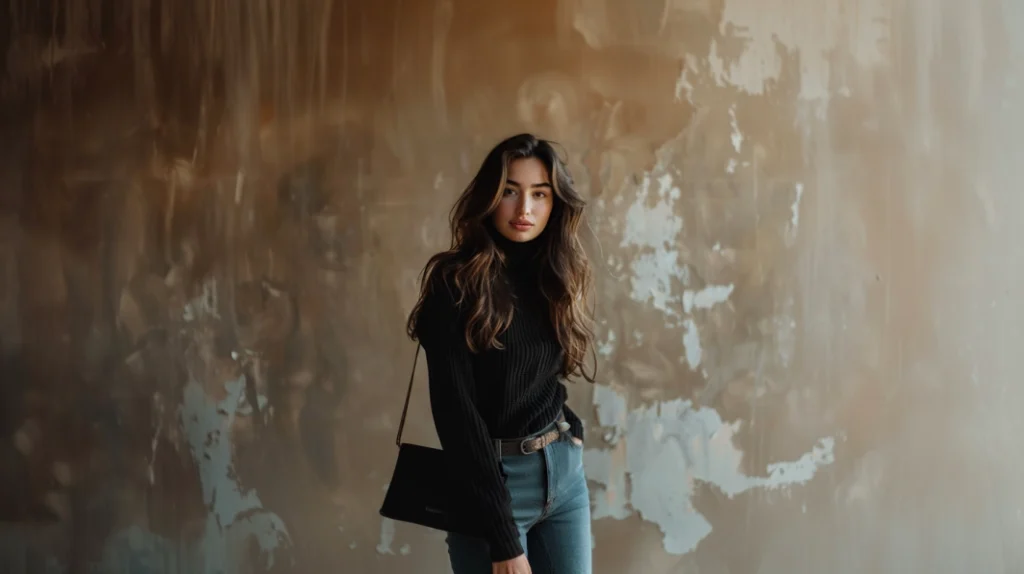 This outfit is all about understated style with a bold edge. A sleek black leather jacket paired with a soft grey turtleneck creates the perfect balance between edgy and cozy. The high-waisted black jeans complete the monochrome vibe, while the form-fitting cuts keep it sophisticated and put-together. This is the kind of look that says, “I’m here to be chic, but I’m not overdoing it.”