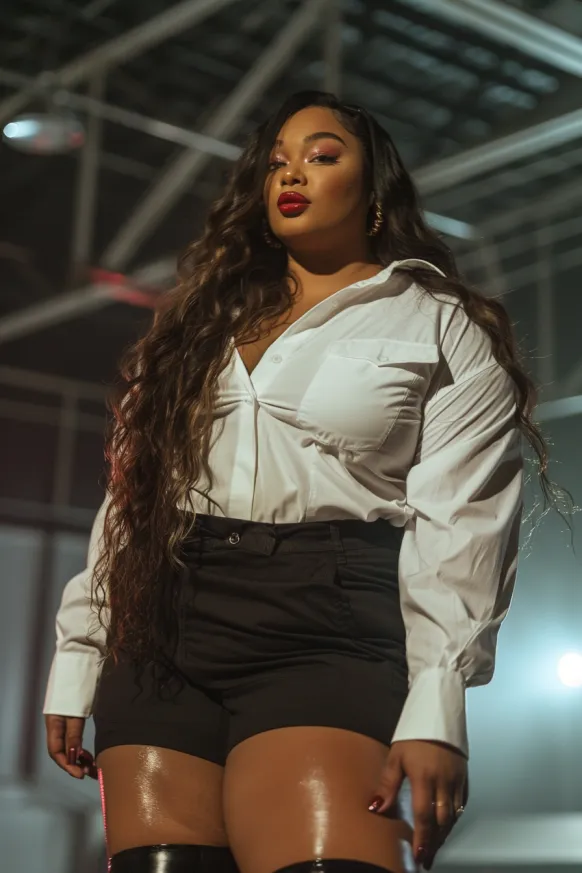 This outfit brings together the perfect mix of edgy and chic. It features a crisp white button-down shirt with a relaxed fit that’s just a little oversized, paired with high-waisted black shorts that create a sleek silhouette. To complete the look, thigh-high black boots add a touch of boldness and confidence. The outfit is effortlessly cool yet sophisticated enough for a concert setting.