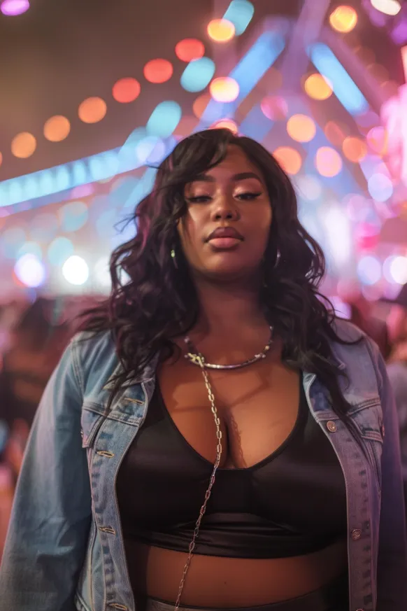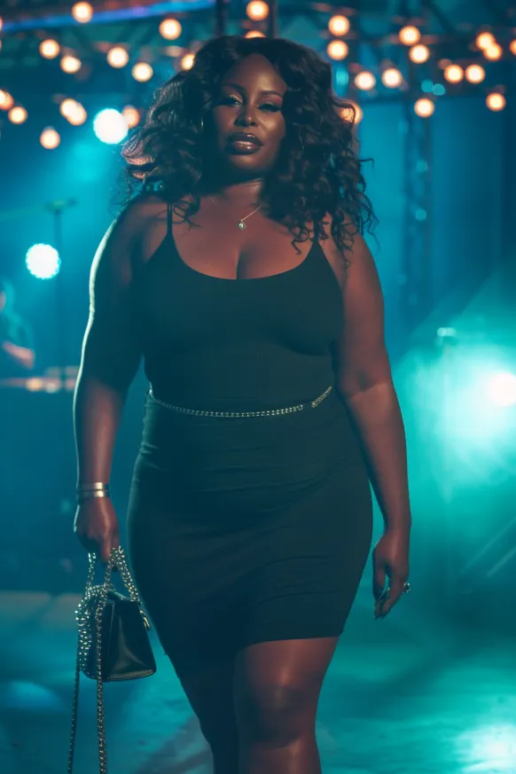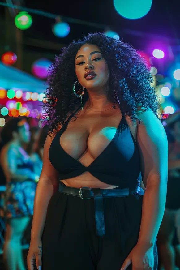 This outfit is the definition of bold and beautiful. It features a sultry black halter top with a deep neckline, paired with high-waisted black pants that accentuate curves in all the right ways. The look is completed with large statement hoop earrings and a sleek belt that cinches the waist. The bright, colorful lights in the background bring out the vibe of the outfit, perfect for a fun, music-filled night.
