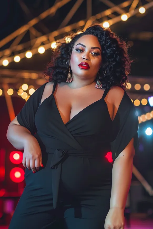 This outfit is sleek, confident, and perfect for a night out at a concert. The black jumpsuit features a plunging neckline and a tie-waist detail that accentuates the curves beautifully. The flowy, draped sleeves add a sense of sophistication, while the fitted bottom creates a flattering silhouette. Bold statement earrings and a fiery red lip elevate the look, making it feel glam and fierce.