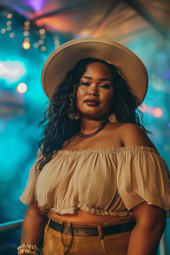 This outfit is the perfect blend of boho and chic, ideal for a fun, lively concert atmosphere. The light, flowing off-the-shoulder top in a neutral beige tone gives it a relaxed and breezy feel, while the high-waisted, tan-colored skirt adds structure and defines the waist. A wide-brimmed hat and wooden accessories complete the bohemian-inspired vibe, giving the outfit a free-spirited edge.