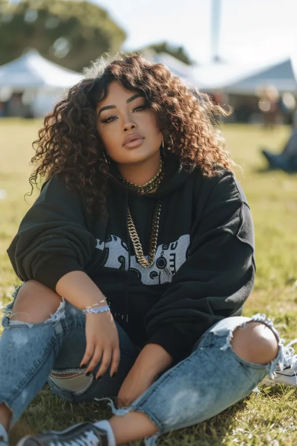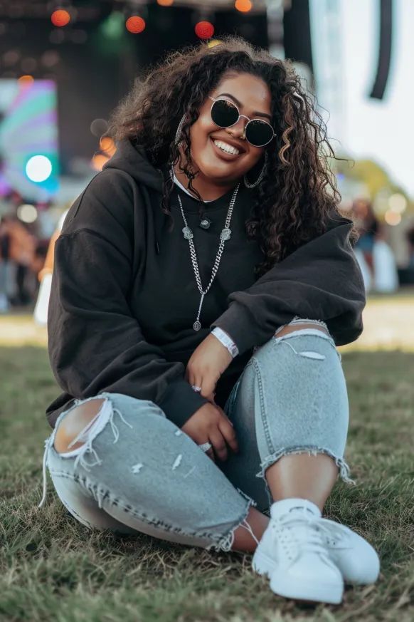 This outfit is all about effortless cool and comfort. It features a black graphic hoodie with a fun design, paired with ripped, light-wash denim jeans. The casual vibe is completed with a pair of classic sneakers, and oversized gold jewelry gives it that extra pop of style. It’s a laid-back yet chic ensemble perfect for a day of rocking out at a concert.