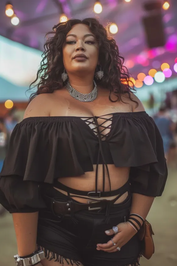 This outfit is bold and full of attitude, perfect for standing out at any concert. The off-the-shoulder top features voluminous sleeves and a deep lace-up front, giving it a sultry, feminine vibe. Paired with black high-waisted shorts that have edgy cut-out details, the look is all about combining sex appeal with sophistication. The chunky statement belt and bold earrings complete the ensemble, making it a show-stopping look.
