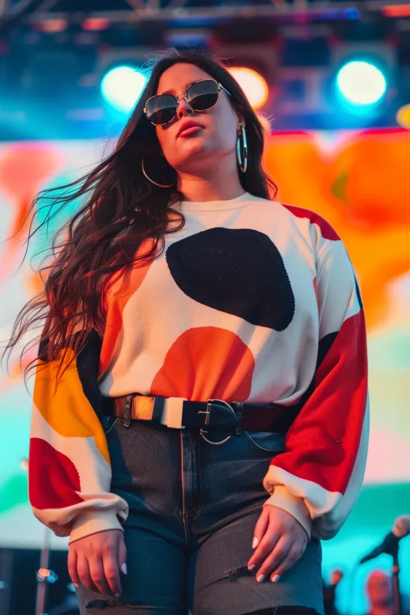 This outfit is a great combination of comfort and statement style. The oversized, colorful sweater features bold graphic shapes in red, orange, and black that make it pop from the crowd. The high-waisted denim shorts keep things casual and comfortable while the white belt adds a structured element to the look. Paired with oversized sunglasses, this outfit screams festival chic and effortless fun.