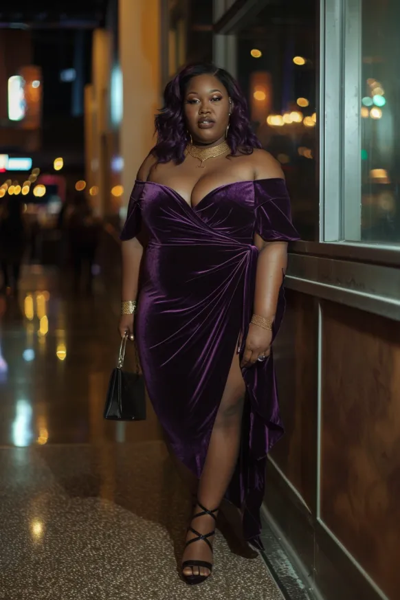 This outfit radiates effortless elegance with a stunning purple velvet dress that drapes beautifully. The off-the-shoulder design adds a dash of sophistication while the thigh-high slit gives it an edgy, modern twist. Paired with a black handbag and strappy heels, this look balances glam with a touch of sass. The golden jewelry enhances the richness of the velvet and pulls everything together for a polished yet daring look.