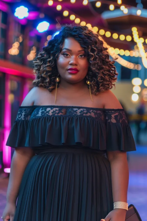 This chic look pairs a black off-shoulder top with delicate lace details, creating a balanced mix of boldness and femininity. The flowing pleated black skirt adds movement and elegance, while the off-shoulder design gives it a sexy but classy vibe. Accessories like oversized earrings and a structured clutch complete the outfit, adding the perfect amount of sparkle and sophistication.