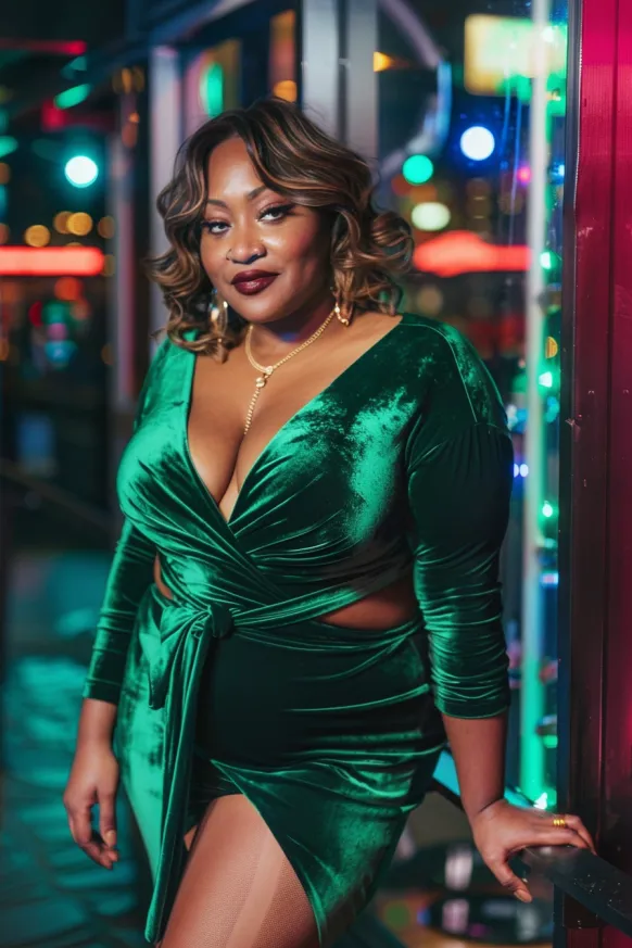 I absolutely adore how this outfit combines elegance with a bit of boldness. The velvet fabric gives it a luxe feel, while the slit keeps it fresh and fun. The rich green is a showstopper, and it’s just the right amount of bold without being too much. I can totally see rocking this outfit at a concert or any evening out when I want to turn heads while still feeling super comfortable and chic! It’s a total winner for anyone wanting to feel glam and powerful.