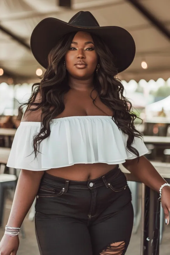 This outfit is all about mixing comfort with a bold fashion statement. It features a flowy white off-the-shoulder crop top that brings a playful, breezy vibe. The top pairs perfectly with high-waisted, black distressed jeans, creating a sharp contrast. To top off the look, a wide-brimmed black hat adds a cool, chic touch, giving the whole outfit a touch of effortless glam.