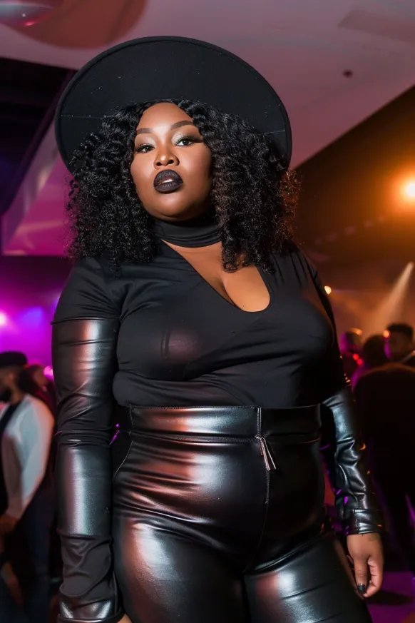This outfit brings the drama and the glam in all the right ways! It features a sleek black bodysuit with dramatic long sleeves and a deep V-neckline, paired with shiny black leather pants that hug in all the right places. A wide-brimmed black hat completes the look, adding an extra dose of edge and mystery. The bold makeup, including a dark lip, ties everything together for an unforgettable concert outfit.