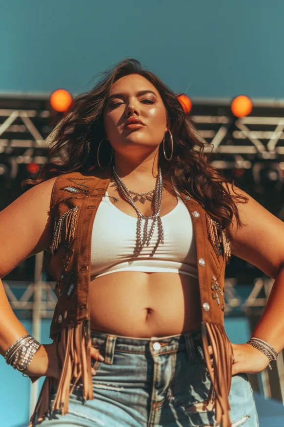 I absolutely love how this look blends casual comfort with a bit of edge. The vest with the fringes adds such a fun, carefree vibe that’s perfect for a country concert. The cropped top and shorts are great for staying cool and showing off some skin while still feeling stylish and put-together. Honestly, this outfit nails it for a plus-size concert look—it’s flattering, trendy, and gives you all the confidence you need to dance the night away!