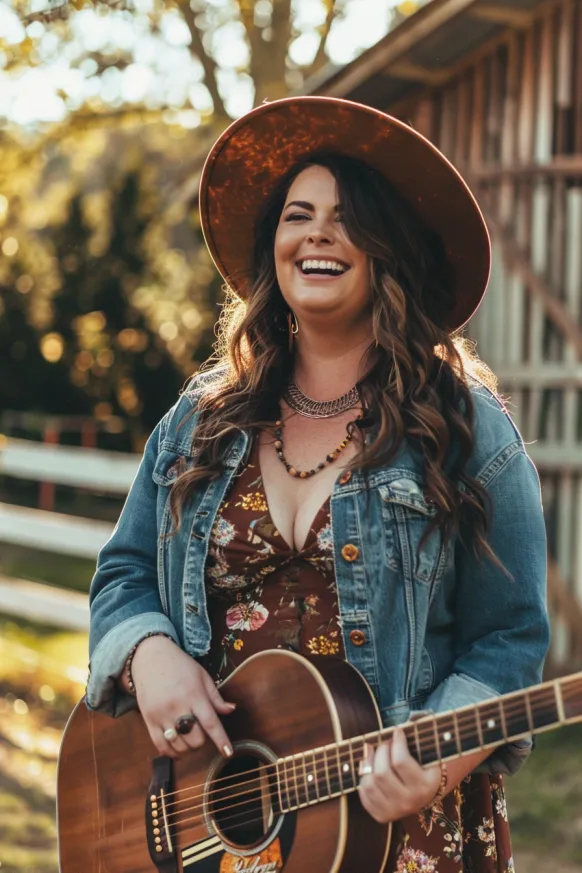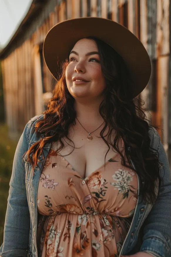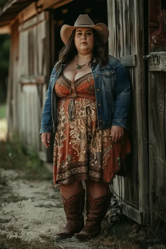 This outfit brings a fun, bohemian twist to classic country style. The rich rust-colored dress with its intricate floral pattern is the star of the show, adding a burst of color and charm. The denim jacket adds a cool, laid-back vibe while the cowboy boots ground the look in true country fashion. The wide-brimmed hat is the perfect finishing touch, giving off that effortless, rustic feel.