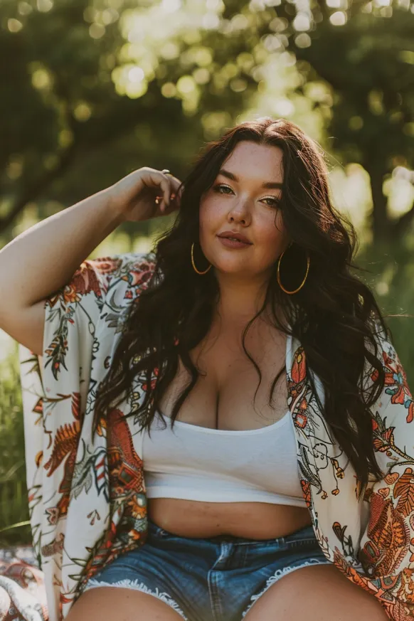 What I absolutely love about this outfit is how light and carefree it feels, while still being stylish. The kimono brings that boho charm that’s perfect for a country concert, and the white crop top and denim shorts keep it practical and cool. Plus, the accessories like the gold hoops add that touch of glamour, making it perfect for standing out without trying too hard. It’s a great example of how you can combine comfort and style, and it definitely makes me want to wear it for a fun day outdoors!