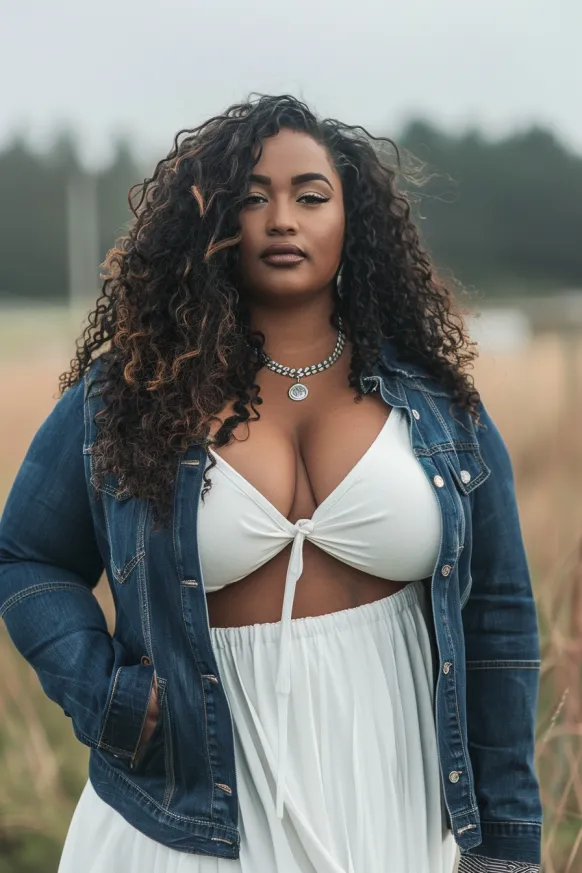 This outfit is a beautiful balance of bohemian chic and country vibes. The white flowy dress, with its soft and relaxed silhouette, exudes a sense of ease and elegance, while the denim jacket adds a casual, structured touch that brings the whole look together. The knotted tie in the front of the dress adds a fun, feminine detail. Paired with a delicate choker and soft, natural curls, this outfit feels effortlessly stylish and ready for any country concert or day out.