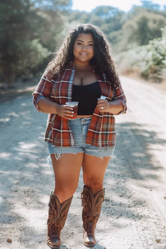 This outfit nails the perfect mix of classic country style and a bit of modern flair. The red plaid shirt is an obvious nod to country charm, but the rolled-up sleeves and open style make it feel more relaxed and effortless. Paired with denim shorts and some detailed cowboy boots, the look screams “laid-back, but stylish.” A simple black tank top peeks through, adding a little edge and showing just the right amount of skin. Plus, the iced drink in hand gives it that extra touch of coolness and fun.