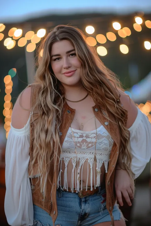 This outfit exudes relaxed boho country vibes that are perfect for a country concert. The cream-colored lace top features beautiful fringe details, adding a fun, free-spirited touch. Layered with a stylish suede vest that’s both practical and fashionable, the ensemble gives off major festival energy. Paired with distressed denim shorts, the look is effortlessly cool and ready for a warm-weather concert. The accessories, like layered necklaces, give it an extra pop of charm.