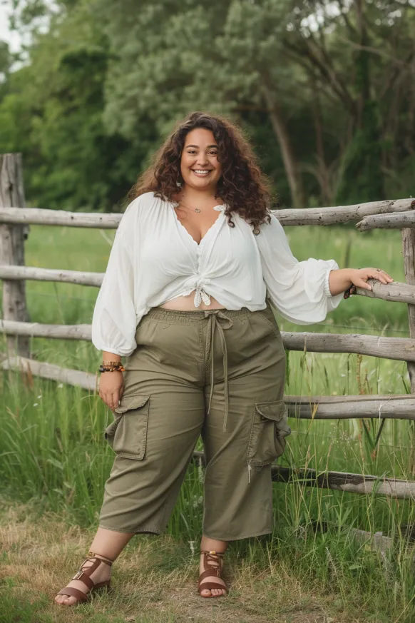 This outfit brings all the cozy vibes with a touch of country flair! The crisp white tied-up blouse with billowy sleeves pairs perfectly with relaxed olive-green cargo pants that add a laid-back, practical edge to the look. The gladiator-style sandals are a great addition, giving the outfit a little extra edge while keeping it comfortable for dancing and walking. A few layered bracelets and a confident smile complete this effortlessly chic ensemble.