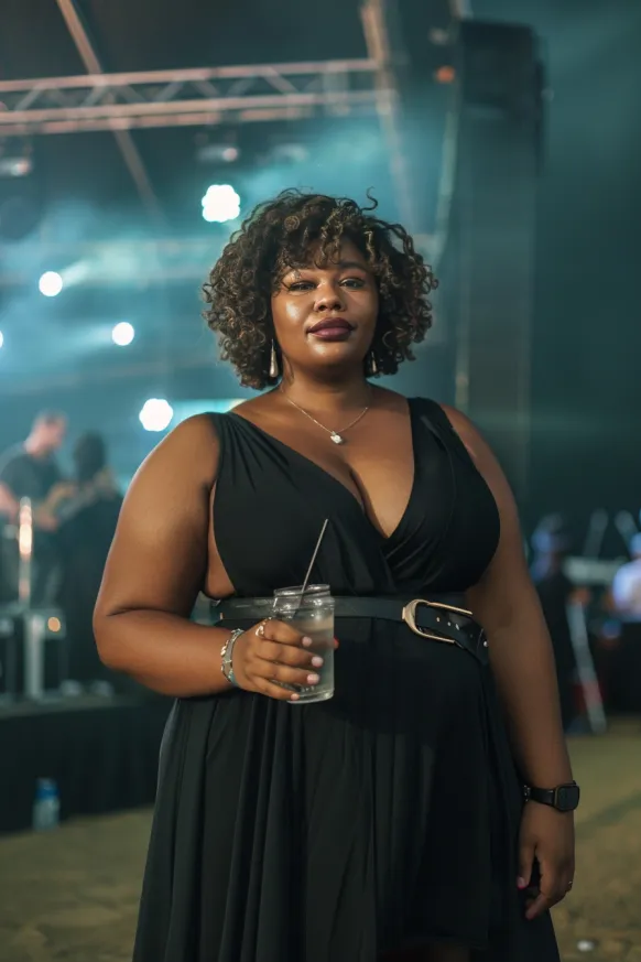 This black, flowing dress is perfect for a country concert, especially when paired with the striking belt that defines the waist. The dress has a subtle plunge at the neckline, giving it a modern yet relaxed vibe. The accessory game is on point with a simple necklace and chunky earrings that elevate the look without overdoing it. The overall combination of comfort and style makes this outfit a great choice for enjoying the music in both style and comfort.