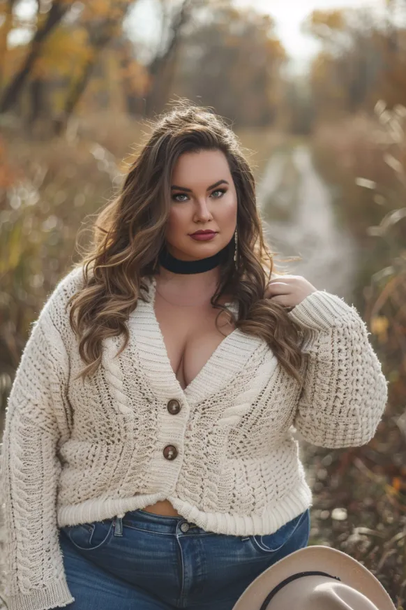 I’m loving how this outfit combines cozy elements like the oversized cardigan with the structured look of the high-waisted jeans. The choker adds just the right amount of edge, while the hat gives a nod to that country vibe we all love. It’s such a perfect balance of relaxed and trendy. Plus, the natural, earthy tones make it feel so approachable, yet still totally concert-worthy. It’s the kind of look that feels both comfy and cool—my go-to for an unforgettable country concert!