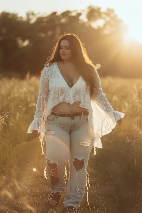 This outfit is such a standout because it’s effortlessly cool while still embracing that free-spirited boho feel. The lace top adds a soft, feminine touch, while the ripped jeans give it just the right amount of edge. I love how the loose fit of the top keeps things easy and breezy, which is ideal when you’re at a concert and just want to vibe without worrying about your outfit. Plus, the light color palette makes it perfect for summer and is easy to accessorize with your favorite pieces! It’s one of those looks that’s fun, trendy, and super comfy—what more could you ask for at a country concert?