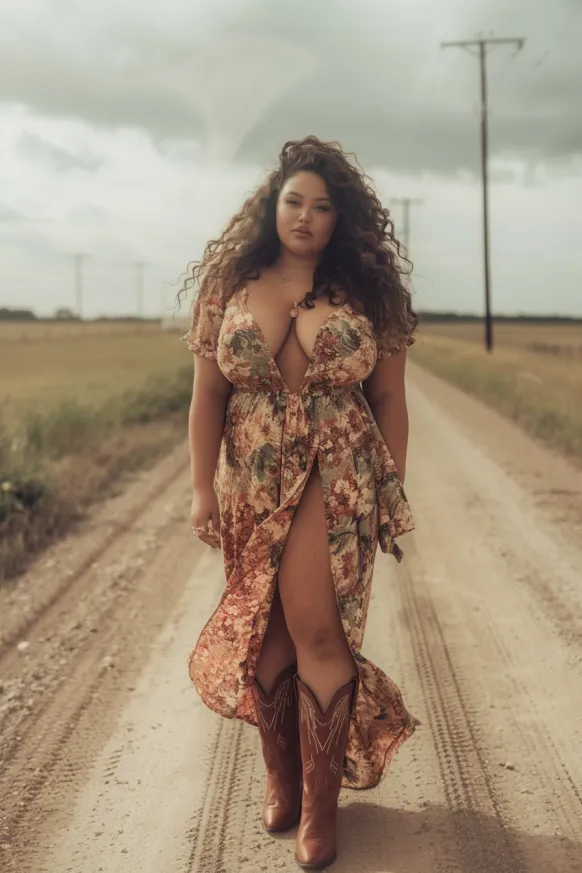 This gorgeous look blends romance with a touch of country flair! The floral print dress features a deep v-neck and a thigh-high slit, which creates a seductive yet soft look that moves with you. The earthy tones of the floral pattern complement the golden hour lighting, while the brown cowboy boots ground the outfit in country style. This outfit is perfect for a country concert where you want to stand out and feel beautiful with every step.