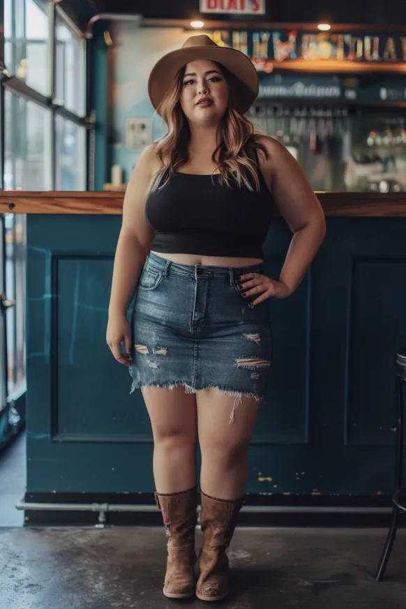 This look is perfect for those laid-back yet stylish country concert vibes! The outfit pairs a simple black crop top with a distressed denim skirt that hits just above the knee, showing off that perfect country girl edge. The tan cowboy boots add a classic, rustic touch, while the beige wide-brim hat finishes off the ensemble with an effortlessly cool flair. The ripped details on the skirt give the look a bit of playful rebellion that’s still totally wearable.