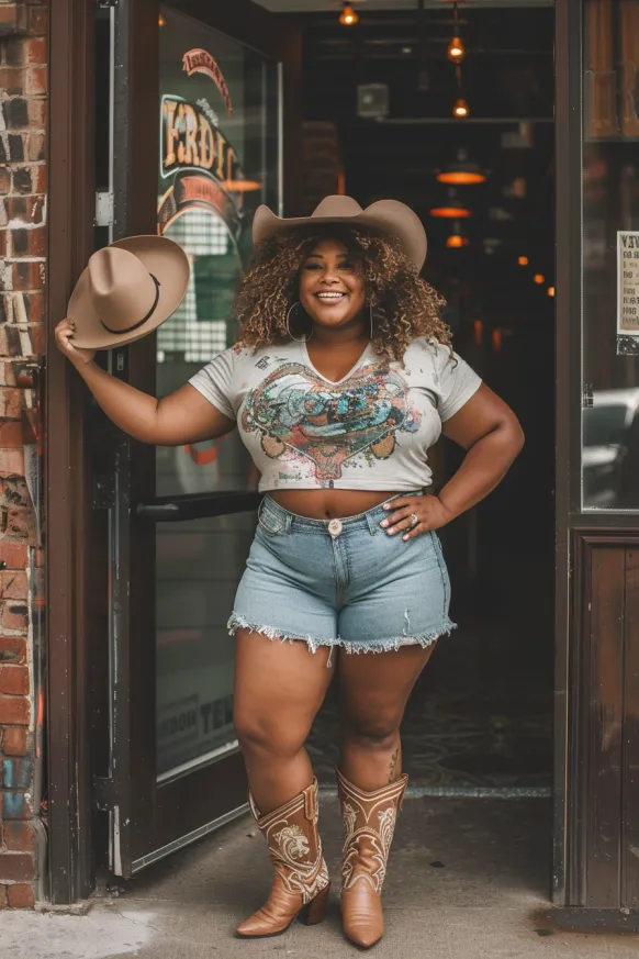 This outfit is serving all the fun country vibes! The graphic crop top with a cute design brings a playful touch, while the high-waisted distressed denim shorts give it that perfect laid-back, festival-ready feel. Of course, no country look is complete without the iconic cowboy boots, and these tan beauties are the perfect match for this look. Top it off with a wide-brimmed tan hat, and you’re ready to turn heads at any concert or outdoor event.