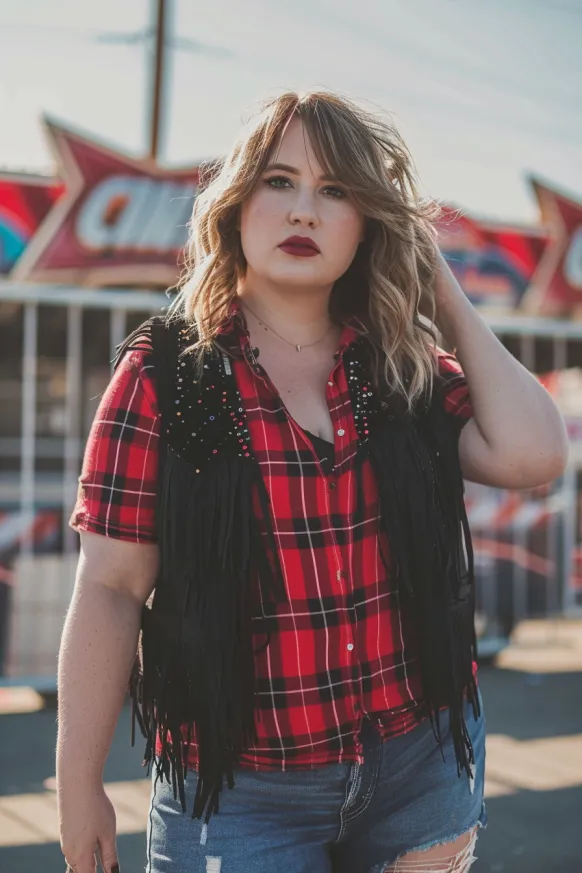 This outfit nails that effortlessly cool country vibe with a touch of edginess. The classic red plaid shirt, with its comfy button-up style, gets an upgrade with a black fringe vest adorned with colorful studs. Paired with distressed denim shorts, this look is the perfect blend of country chic and a little rock ‘n roll. The fringe adds movement and a bit of drama, making it a great choice for dancing at a concert or enjoying the outdoor festivities.