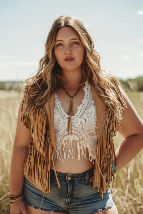 This outfit is all about embracing that bold, bohemian country look! The tan fringed vest adds movement and texture to the outfit, making it perfect for dancing and twirling at a concert. Pairing it with a delicate white lace crop top gives a gorgeous feminine touch, while the distressed denim shorts keep it casual and comfortable. The simple, earthy necklace and bracelet add just the right amount of detail without overpowering the look.