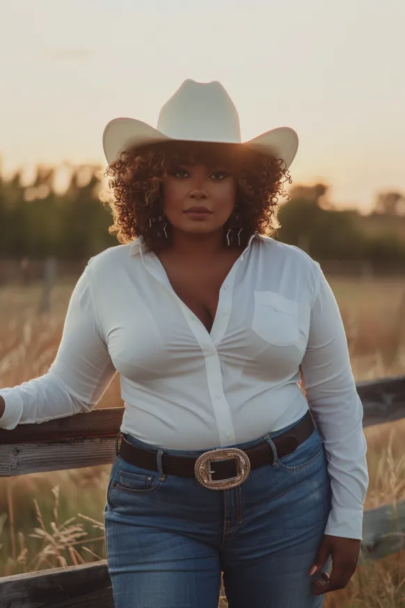 This outfit is a true country classic, combining timeless pieces with a chic, modern edge. The crisp white button-down shirt gives off a polished yet relaxed vibe, while the high-waisted blue jeans provide that flattering, comfortable fit. The bold black belt with a statement buckle adds a touch of country flair, and the wide-brimmed white hat perfectly ties the whole look together, making it ideal for a country concert or outdoor event.