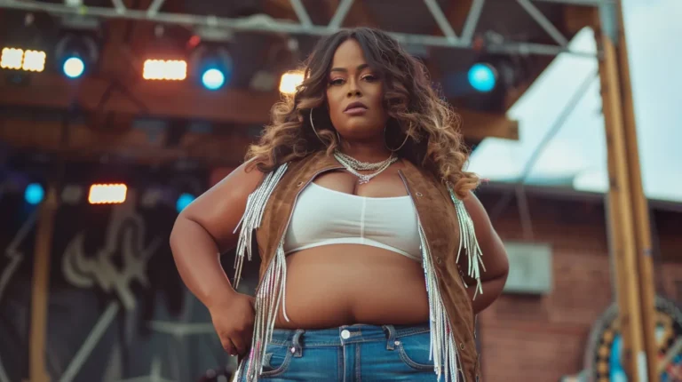 I absolutely love how this look blends casual comfort with a bit of edge. The vest with the fringes adds such a fun, carefree vibe that’s perfect for a country concert. The cropped top and shorts are great for staying cool and showing off some skin while still feeling stylish and put-together. Honestly, this outfit nails it for a plus-size concert look—it’s flattering, trendy, and gives you all the confidence you need to dance the night away!