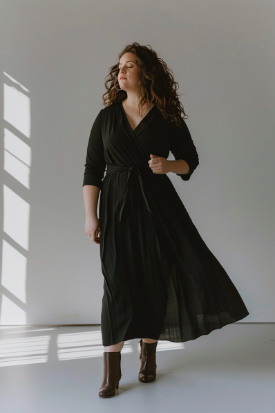 This outfit features a chic black wrap dress that effortlessly drapes over curves, creating a beautiful silhouette. The wrap style cinches the waist, emphasizing shape while maintaining a comfortable, breathable feel. The long sleeves and flowy fabric give it an effortlessly elegant vibe, perfect for cooler weather. Paired with stylish ankle boots, this look brings just the right amount of casual edge to balance the overall sophistication.
