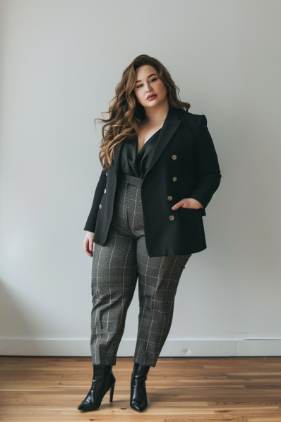 What I love about this outfit is how it instantly makes you feel powerful and put-together. The combination of a tailored blazer with those plaid trousers gives off major boss vibes, but the subtle plaid pattern keeps it fun and approachable. The black ankle boots are a great addition, giving you a little bit of height and confidence. This is one of those outfits that makes you feel like you can conquer the world while still looking totally chic and date-night ready!