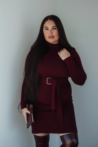 I’m totally obsessed with how this outfit effortlessly combines sophistication and warmth. The burgundy color is not only striking but also super flattering for a wide range of skin tones. Plus, that belt detail? It does wonders for creating an hourglass silhouette. The over-the-knee boots bring in a little bit of sass, which I think is always a fun touch on a first date. This look is perfect for when you want to make a stylish impression while still staying cozy—like if you’re going out for a nice dinner or to a festive winter event!