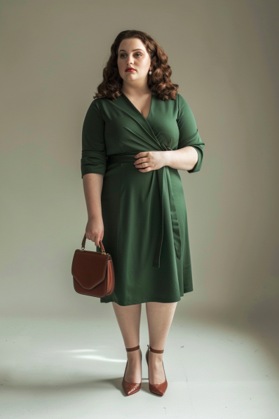 This outfit exudes classic elegance with a beautifully fitted green wrap dress. The wrap style cinches at the waist, creating a flattering silhouette that highlights curves in the most effortless way. The knee-length cut and 3/4 sleeves make it a versatile option, perfect for year-round wear. Paired with deep brown heels and a matching structured handbag, the look is polished and refined, making it ideal for a dinner date or a more formal outing.