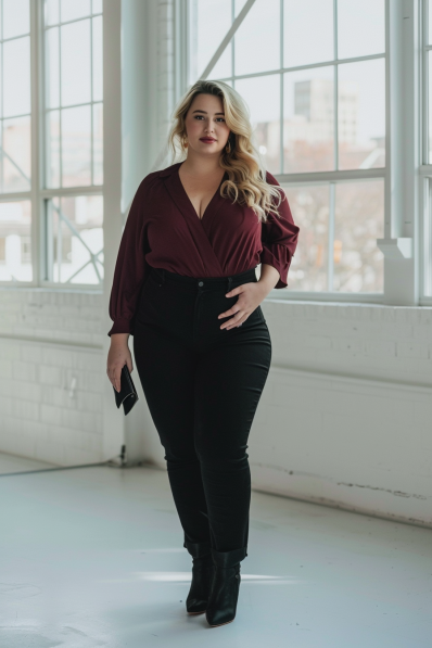 What I love most about this outfit is how it mixes softness and structure in such a balanced way. The burgundy blouse adds a pop of color and femininity, but the black jeans ground the look, giving it a sophisticated edge. It’s comfortable yet stylish, making you feel confident without sacrificing comfort. And those ankle boots? They add a little extra height and attitude, making this outfit versatile enough for almost any date setting. It’s the perfect combo of chic and casual!