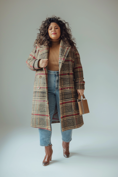 Cozy Plaid Coat with High-Waisted Jeans and Turtleneck