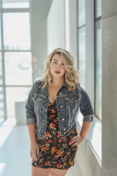 This playful and flirty outfit pairs a bold floral mini dress with a classic denim jacket, giving off major laid-back yet cute vibes. The floral dress is vibrant and eye-catching, showing off personality while still keeping things casual. The denim jacket adds a layer of relaxed coolness, making this outfit versatile enough for both a daytime coffee date or a casual evening hangout. It’s the kind of look that’s effortlessly fun and approachable.