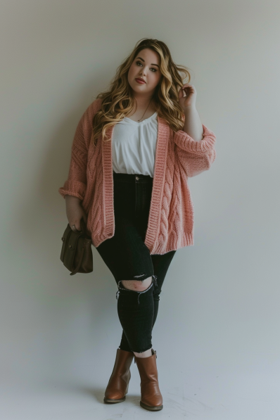What I love most about this look is how easy it is to throw together while still looking like you put in some effort. That pink cardigan is such a vibe—like you’re wrapped in a soft blanket, but in a cute way. The ripped jeans bring just enough attitude to make sure it’s not too sweet, and those ankle boots? They totally ground the outfit. This is one of those looks where you feel super comfortable but still look stylish and put-together, and really, isn’t that the dream on a first date?