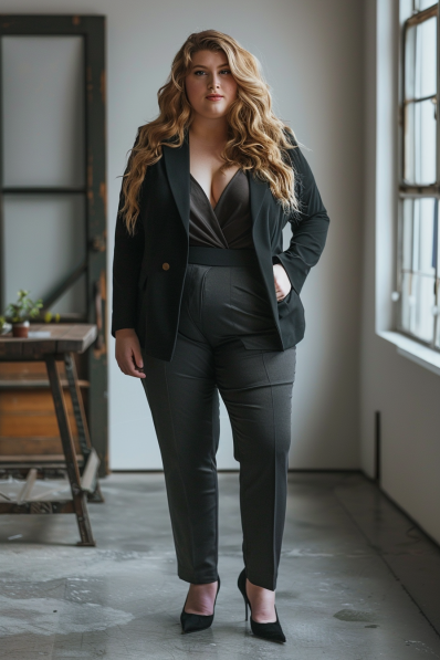I have to say, this look is for those dates where you want to walk in and own the room. The blazer and trousers combo is sleek and timeless, but that plunging top adds just the right amount of spice. It’s professional yet playful—a total confidence booster. And the heels? They’re the cherry on top, giving you that little boost (literally and figuratively!). This is an outfit that shows you’re stylish and strong but also ready for a little fun. Perfect for a date that involves cocktails or a fancy dinner.