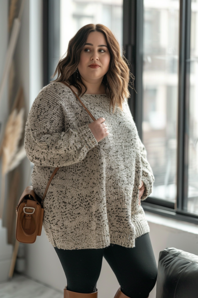 This outfit is all about cozy comfort! The oversized speckled knit sweater is perfect for those chilly first dates where you want to stay warm and look effortlessly cute. Paired with simple black leggings, this look is both relaxed and flattering, letting the sweater be the main attraction. The knee-high brown boots add a bit of structure and style, giving the outfit a polished finish. The crossbody bag adds a casual touch, making this look ideal for a low-key coffee date or a stroll through the park.