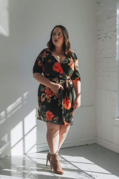 This bold floral wrap dress is a stunning choice for a first date! The deep green background perfectly complements the vibrant red and orange floral pattern, making it eye-catching without being too loud. The wrap style hugs the body in all the right places, accentuating curves while still feeling comfortable and breathable. The mid-length sleeves and knee-length hem make it a great option for any season. Paired with sleek brown ankle boots, this outfit is perfect for a dinner date or any occasion where you want to feel dressed up yet relaxed.
