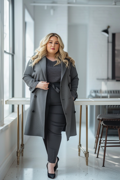 This outfit is the epitome of modern sophistication. The long gray trench coat creates an elegant and sleek look, perfect for cooler days. Underneath, a matching gray sweater and high-waisted tapered trousers offer a monochromatic vibe that is both polished and stylish. The belt detail on the trousers accentuates the waist, giving a structured yet comfortable fit. Completing the look with classic black heels adds a touch of height and professionalism, making this outfit a fantastic choice for a more formal first date, like a fancy dinner or a night at the theater.