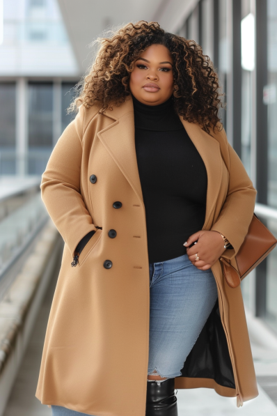 This chic camel coat paired with a sleek black turtleneck is a timeless combination that’s both classic and cozy. The long coat instantly elevates the outfit, adding a layer of sophistication. Underneath, the black turtleneck provides a streamlined silhouette, while the light-wash jeans keep the look casual and comfortable. Knee-high black boots tie it all together, giving the outfit just the right amount of edge. With a small brown handbag as the perfect accessory, this look is ready for anything from a city walk to a casual coffee date.