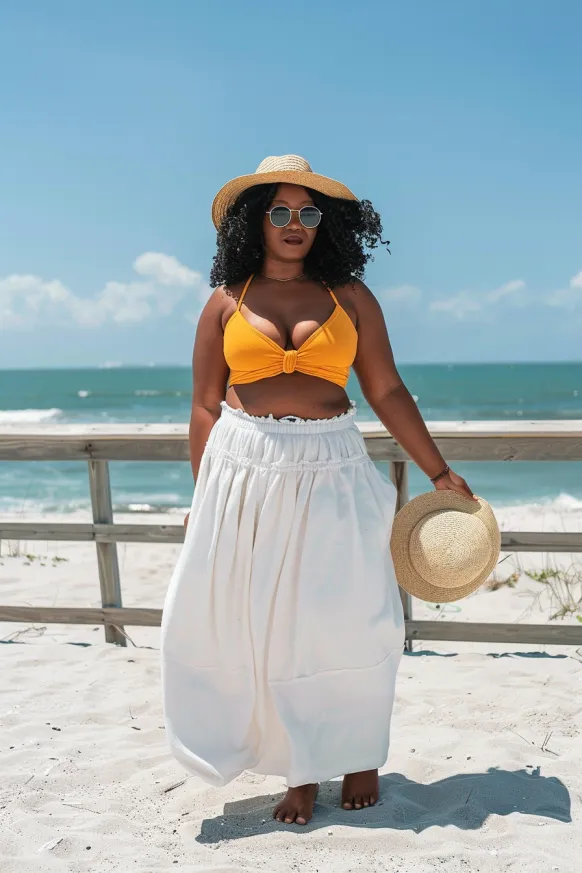 This outfit is the ultimate beachside power move. The top is a vibrant yellow bikini-style crop with a twist-front detail that gives it a playful, summery vibe. Paired with it is a high-waisted white maxi skirt that’s full and flowy, with a gathered waistband that sits comfortably and creates a beautiful contrast against the fitted top. She finishes the look with round sunnies, a wide-brim straw hat, and confidence that’s brighter than the sun.